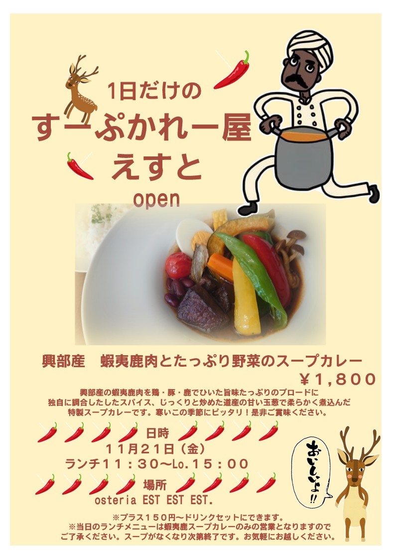 Home 未分類 ランチ特別営業のお知らせ ランチ特別営業のお知らせ 2025.11.5 未分類 Tweet Share いつも当店をご利用いただきありがとうございます。 ランチ特別営業のお知らせです。 11月21日(金)はいつもと違ったランチ営業をいたします。 『1日だけのすーぷかれー屋えすと』と題しまして、『興部産 エゾ鹿肉とたっぷり野菜のスープカレー』を提供いたします。 メニューは1つだけです。 お気軽にご来店いただけると幸いです。数に限りがありますので、スープなくなり次第終了とさせていただきます。 またご予約はお電話にて承りますのでよろしくお願いいたします。 皆様のご来店お待ちしてます。 スタッフ一同 Tweet Share