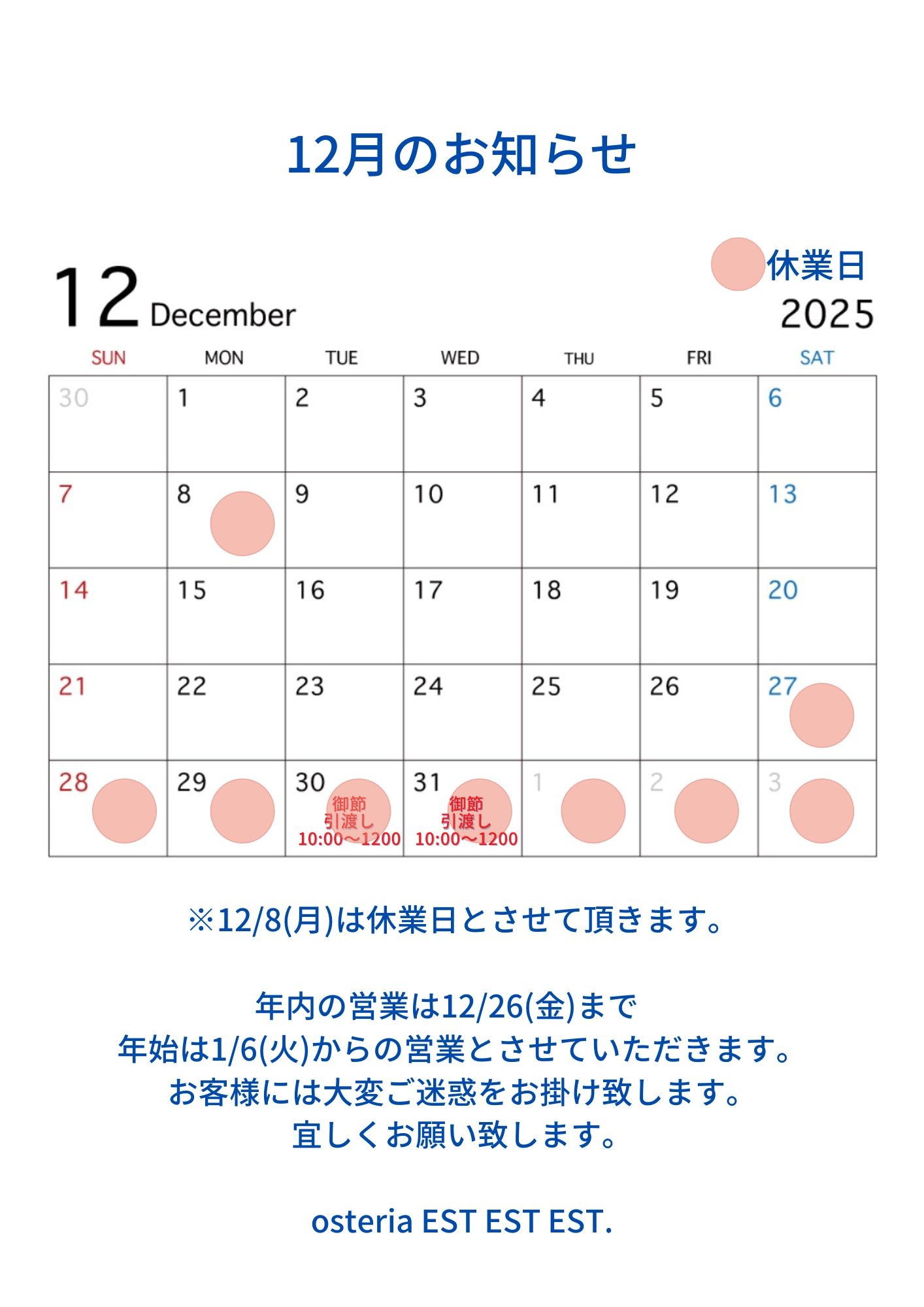 また本年の営業は御節の準備のため12月26日(金)までとさせていただきます。